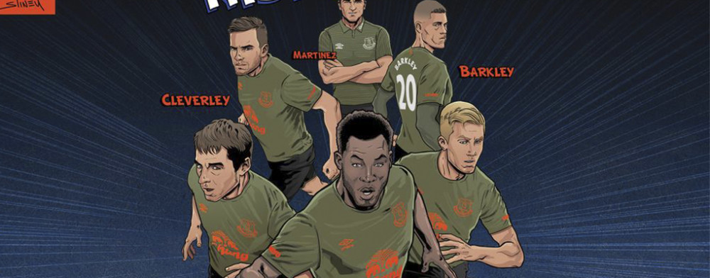 El día de hoy fue presentado el tercer kit del Everton de la mano de Umbro. A diferencia de lo hecho con los uniformes local y visitante, la marca del doble diamante no presento este kit con bebes, sino con un estilo de portada de comic presentando el uniforme con las imágenes de algunos jugadores como Lukaku y Cleverly portándolo en acción. Los Toffees innovan con su tercer uniforme al mostrar una camiseta de corte por demás sencillo en verde militar casi en su totalidad, con apenas un detalle negro rodeando toda la zona baja de la camiseta y anaranjado brillante en el doble diamante de la marca, el escudo monocromático del club y el patrocinio de Chang; el uniforme se complementa con short negro y medias verdes militar con acentos negros.